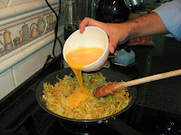 Faz-se um refogadozito só com a cebola e o alho francês, com um nadinha de gordura, até estarem ambos bem moles e macios. Vão-se juntando as batatas aos poucos, misturando e esperando que amoleçam um pouco (se juntarem batatas fritas em casa não serão tão “rijas” e levará menos tempo). Por último juntam-se os ovos bem batidos. Mistura-se tudo, e está pronto a servir.